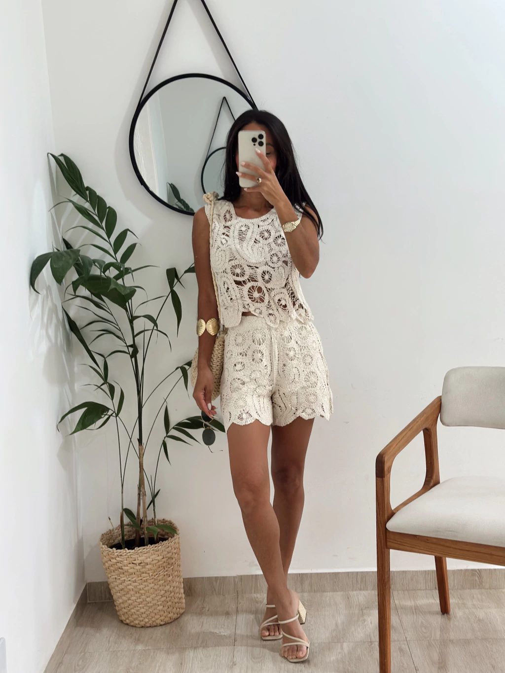 Conjunto Rendado Florence Conjunto composto por blusa e short totalmente rendados, com forro para maior conforto e segurança. O short possui elástico na cintura, garantindo ajuste perfeito e comodidade durante o uso.