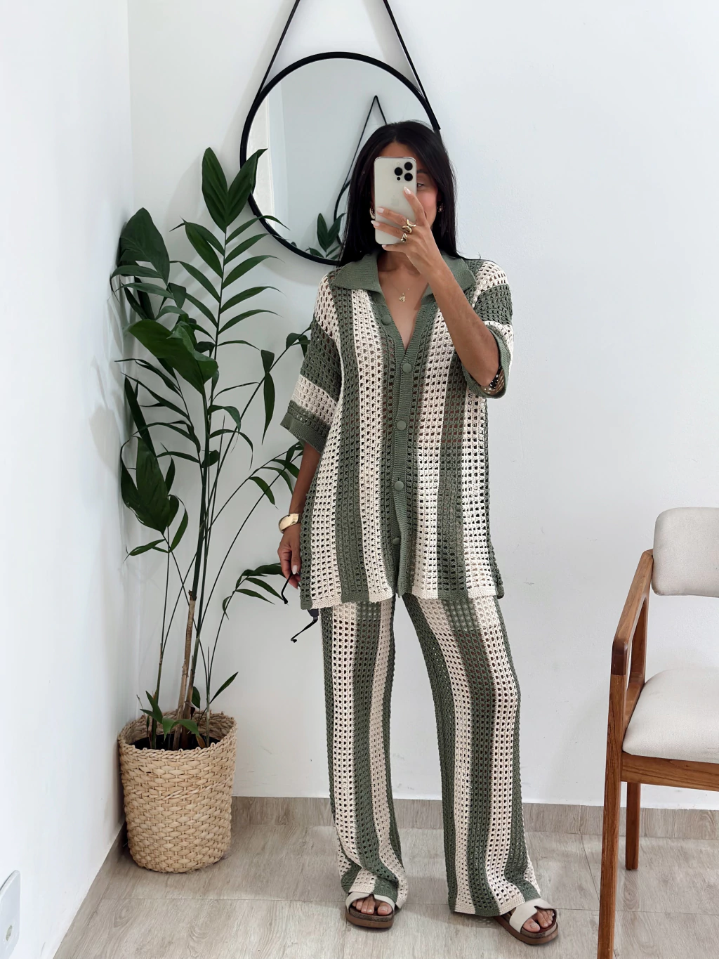 Elegante e contemporâneo, o conjunto em tricô traz o equilíbrio perfeito entre conforto e estilo. A blusa tipo camisa alongada, com modelagem oversized, apresenta botões frontais que permitem diferentes formas de uso: aberta, sobreposta ou fechada. Criando um visual moderno e despretensiosamente sofisticado. O tricô de ponto mais aberto confere leveza e textura à peça, tornando-a ideal para produções cheias de personalidade.